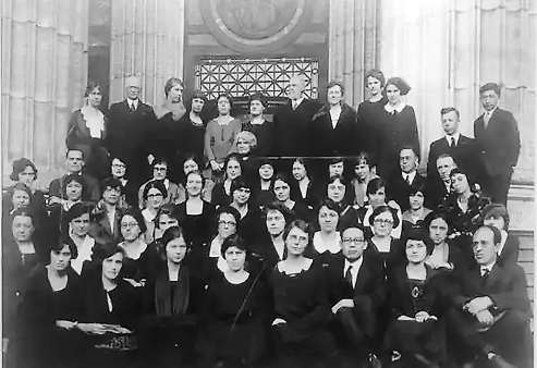 1921級(jí)、22級(jí)紐約州立圖書(shū)館學(xué)校學(xué)員與教員合影,第一排右三為袁同禮先生。