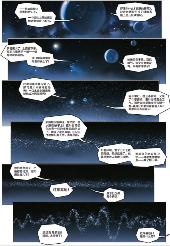 宇宙尺度由近至遠(yuǎn),通過兩頁圖就將葉文潔的過往都交待了