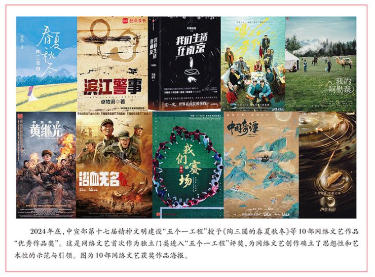 2024年底,中宣部第十七屆精神文明建設(shè)“五個一工程”授予《陶三圓的春夏秋冬》、《濱江警事》(第1部)、《我們生活在南京》3部網(wǎng)絡(luò)文學作品,《漫長的季節(jié)》、《我的阿勒泰》2部網(wǎng)絡(luò)劇,《特級英雄黃繼光》、《浴血無名·奔襲》2部網(wǎng)絡(luò)電影,系列紀錄片《我們的賽場》、網(wǎng)絡(luò)動畫片《中國奇譚》和網(wǎng)絡(luò)綜藝節(jié)目《聲生不息·寶島季》等10部網(wǎng)絡(luò)文藝作品“優(yōu)秀作品獎”。這是網(wǎng)絡(luò)文藝首次作為獨立門類進入“五個一工程”評獎,為網(wǎng)絡(luò)文藝創(chuàng)作確立了思想性和藝術(shù)性的示范與引領(lǐng)。