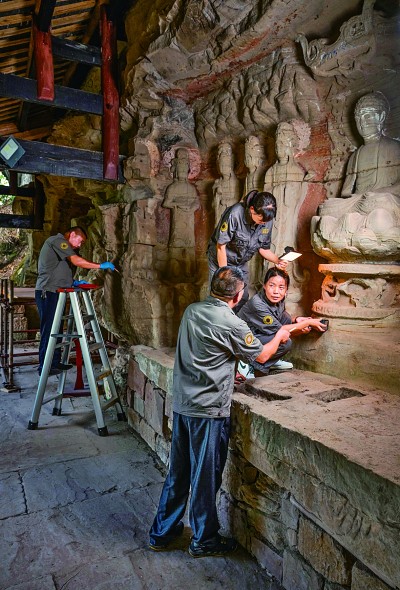 大足石刻研究院保護工程中心的文物修復人員正在進行文物修復。