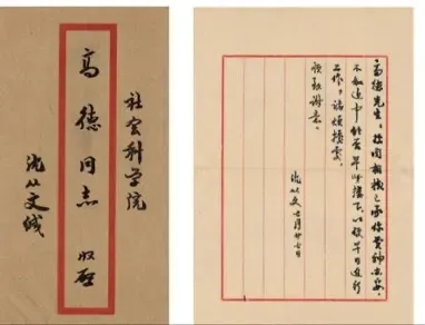 2017年12月24日由西泠印社拍賣有限公司舉辦的“2017年秋季拍賣會”之“中外名人手跡專場暨長言聯(lián)書法專題”專場拍出此二信,12月21日信共二紙,對開十行箋黑色毛筆豎寫;7月27日信共一紙,八行箋黑色毛筆豎寫。并附有一個信封,收信人信息是“社會科學(xué)院 高德同志 收啟”,寄信人信息是“沈從文緘”。二信輯校如下: