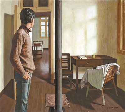 《思想者》左手側(cè)的墻面上,懸掛著袁慶一于1984年創(chuàng)作的布面油畫《春天來了》。畫面中一位穿著高領(lǐng)毛衣的男青年側(cè)身轉(zhuǎn)頭望向窗外,窗外隱約露出春天的嫩綠,寫字臺上翻開的書本和青蘋果,是上世紀(jì)70年代末80年代初恢復(fù)高考后一代青年奮斗和期待的映射。