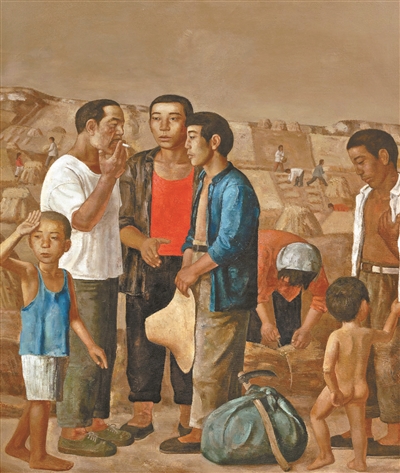 段建偉的大尺幅布面油畫《麥客到來》創(chuàng)作于1994年,他的畫筆下沒有宏大敘事,只呈現(xiàn)生活的真實(shí)質(zhì)感。畫面中前景是正在談價錢的麥客與農(nóng)民,背景是金黃的稻田和收獲的場景。上世紀(jì)80年代至90年代,市場經(jīng)濟(jì)的發(fā)展使得鄉(xiāng)村出現(xiàn)勞動力跨地區(qū)流動的現(xiàn)象,老實(shí)巴交不再是農(nóng)民的代名詞,他們大大方方地談價錢,用自己的勞動換取報酬。畫家敏銳地捕捉到這一現(xiàn)象,并把他們的形象用畫筆記錄下來。段建偉的畫風(fēng)完全不是主題性創(chuàng)作的寫實(shí)嚴(yán)謹(jǐn),畫中人物線條圓潤,有很明顯的樸拙感,畫家不再為了表現(xiàn)主題而繪畫,而是畫眼中所見、心中所感。