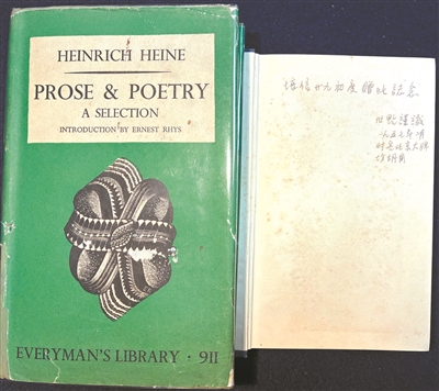 《海涅詩文選》(Prose & Poetry: A Selection)的前襯頁上方鋼筆題寫:“給培信:廿九歲生日記念。世點(diǎn),一九五七.二.北京。”