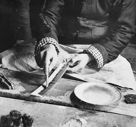 賈春發(fā)是傳統(tǒng)制筆業(yè)的后人,毛筆技師。他聽父親和師傅們講,民國年間,兩間房就能開作坊,居住與生產(chǎn)是混在一起的。比如,晚上睡覺的鋪板,白天支上就可以當(dāng)干活用的水板,干活的時候沒有凳子桌子,都是盤腿坐在炕上,把水板放到盤起的腿上,在水板上做活。