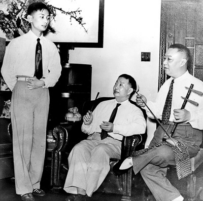 梅蘭芳在北京護(hù)國(guó)寺寓所指導(dǎo)梅葆玖吊嗓,王少卿操琴