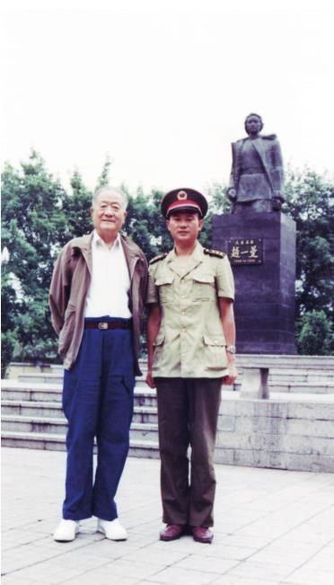 1991年,劉白羽(左)與胡世宗在哈爾濱一曼街趙一曼雕像前。 受訪者供圖
