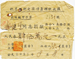 抗美援朝時秦健生的捐款收據(jù)
