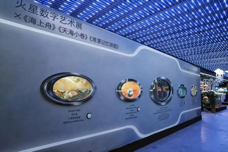 為了實現(xiàn)這一宏愿,展覽創(chuàng)造性地將科幻文學(xué)IP轉(zhuǎn)化為敘事主線:聯(lián)名東方幻想小說《港漂記憶拼圖》《海上舟》,由著名動畫導(dǎo)演張鋼、鄭重帶領(lǐng)中國美院生成式人工智能藝術(shù)設(shè)計創(chuàng)新實驗室,從海港城市飛向宇宙星河,以“分布式敘事”講述中國航天的跨行星敘事。觀眾穿行于火星基地觀察窗,按下交互裝置即點亮飛船舷窗,拼合未來火星的記憶碎片。
