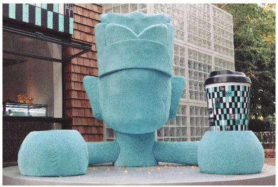 上?!岸讯讯选笨Х瓤扉W店外,以三星堆大立人為原型打造的絨布藝術(shù)裝置格外醒目