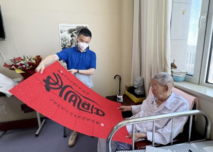 2025年7月5日,冒著近四十度的高溫,我到石家莊看望即將迎來百歲壽辰的徐光耀先生。出發(fā)前兩天,我琢磨擬了副賀壽聯:“筆燃烽火,嘎子英姿傳萬代;墨灑春秋,文壇巨擘壽期頤”,并請青年書法家鐘鏑揮毫寫就。進入醫(yī)院病房,精神矍鑠的徐光耀先生雙手合十歡迎我的到來,那份熱忱讓人心里暖暖的。
